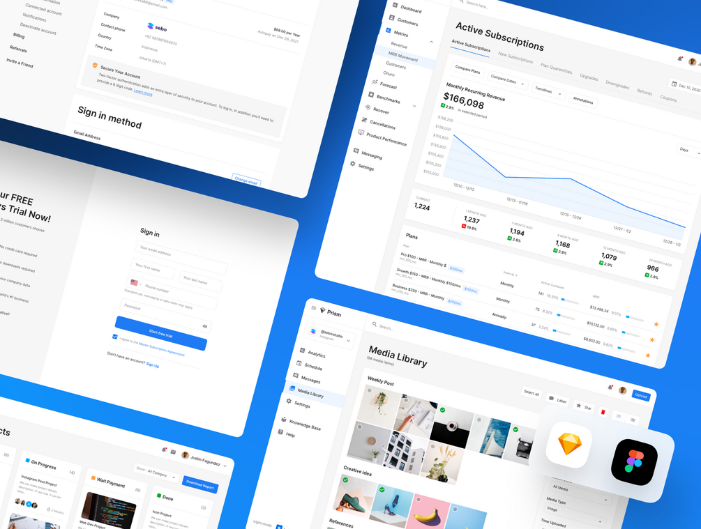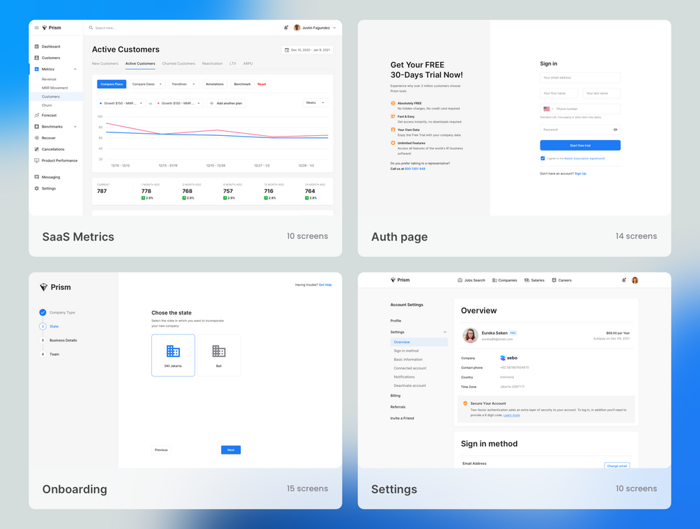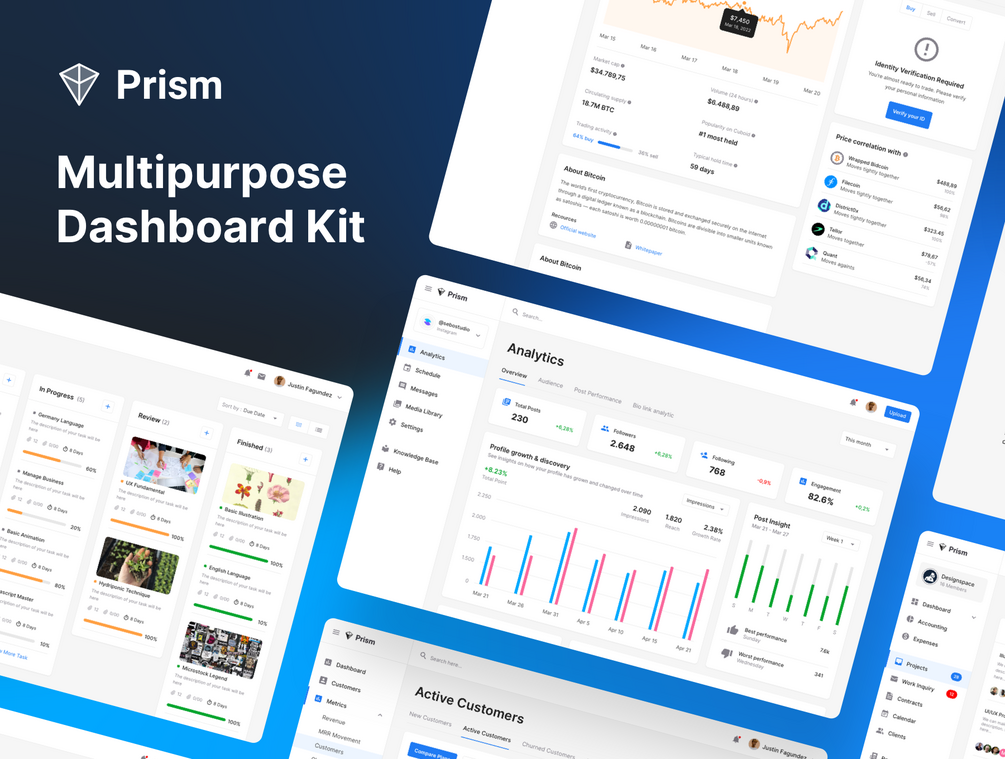 Prism is a modern, minimalist, and easy to use dashboard UI Kit for multi-projects. It contains 100+ pre-made dashboard design in 10 categories. It can be used for all design process starts from prototype to final project. The product made from scratch with Sketch and Figma.
